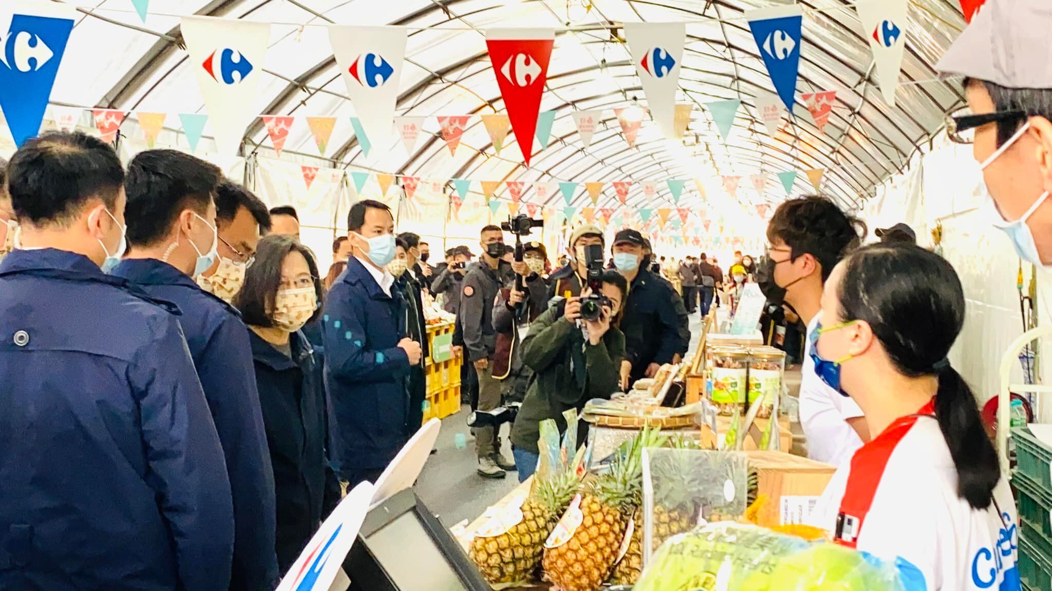 總統蔡英文也親自走訪市集,陪同的農委會主委陳吉仲更主動介紹,表示家樂福長期支持台灣農民並推廣非籠飼雞蛋,促進產業升級!