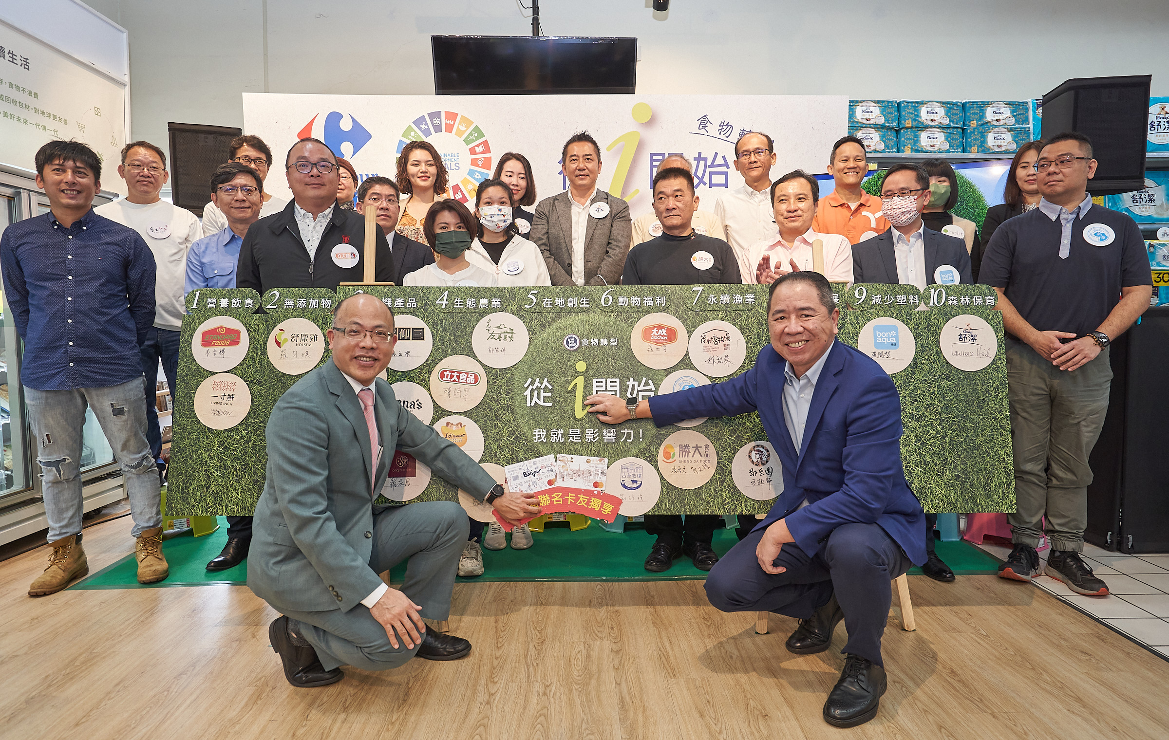 記者會現場家樂福邀請永續先行者簽署跨域共好聯盟,家樂福期待透過這次推出的從i開始計畫,讓跨領域夥伴一起共同實現聯合國永續目標(SDGs)第12項負責任的消費與生產。出席夥伴包含玉山銀行、台鹽生技、歐萊德、太古、佳格、綠藤生機、一寸鮮、茂林、馬玉山、吉蒸鮮乳、福樂、台農、日村實業有限公司、有幾園生物科技、福業、集元果、高仰三、源天然、大成長城、立大農畜、金豐盛、農緯果菜、月光下友善農場、妮娜、向陽咖啡、嵩岳咖啡莊園、雀巢、好來化工、金百利..等,家樂福未來也將持續廣邀更多供應商及生產者共同加入從i開始計畫。