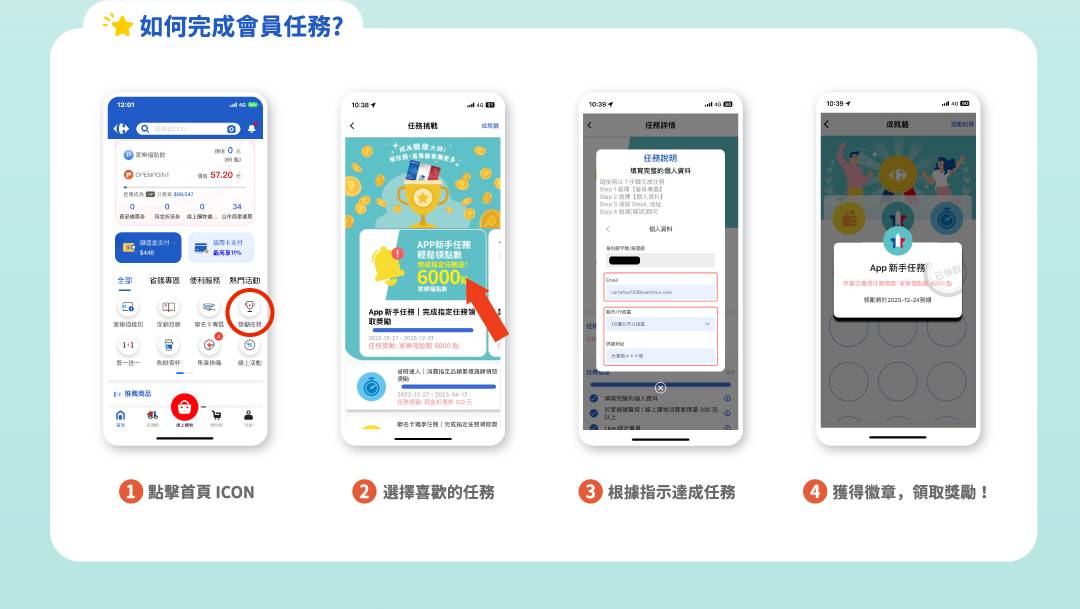 • 於家樂福獎勵任務功能完成指定任務內容視為完成任務,完成指定內容後,點擊【領取任務獎勵】按鈕可以領取指定獎勵。
