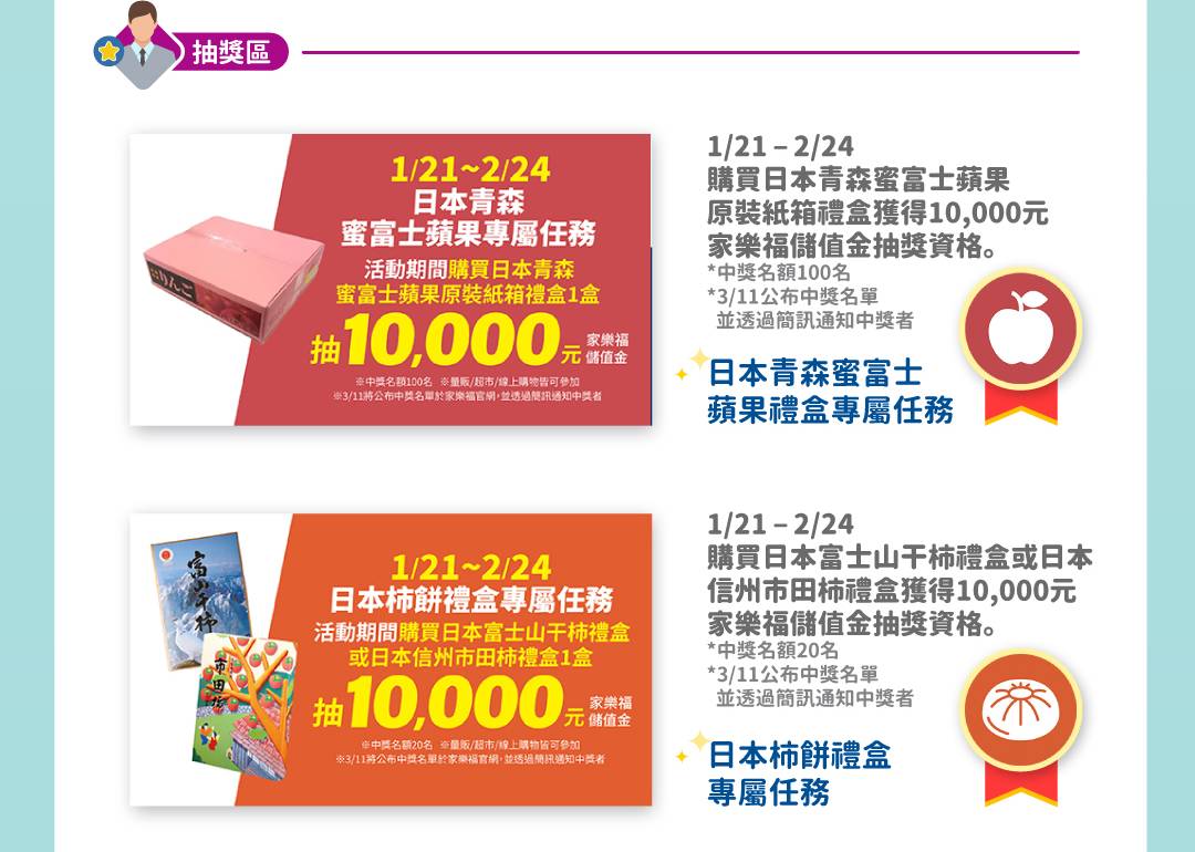 • 家福股份有限公司為本活動主辦單位,就本活動保有修改、暫停、終止活動辦法之權利;如遇活動辦法修改,將於官方網站或家樂福APP公告,不另行通知。