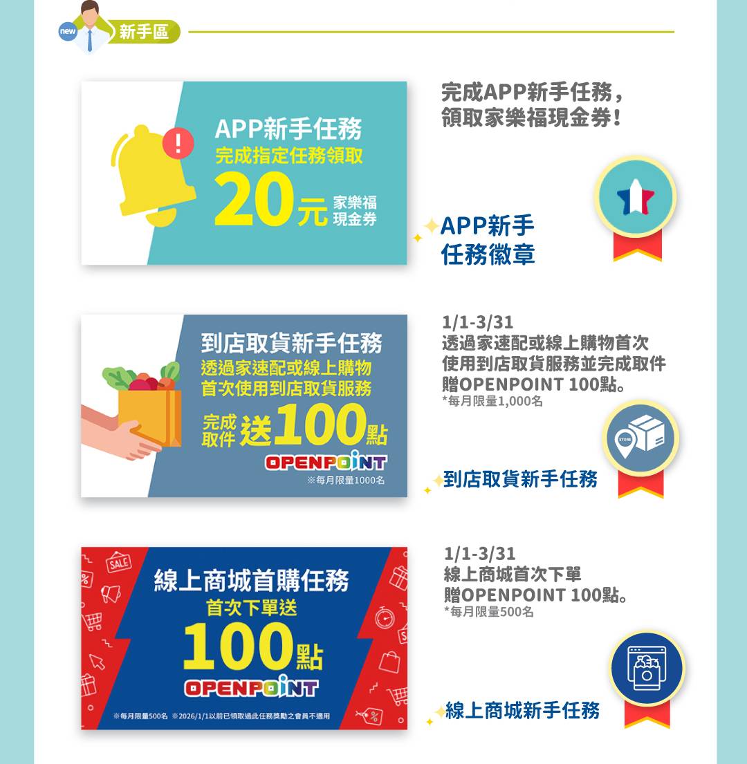 • App新手任務/錢包新手任務/聯名卡友獨享任務/線上購物新手任務的家樂福點數獎勵,將於24小時內自動匯入帳戶。