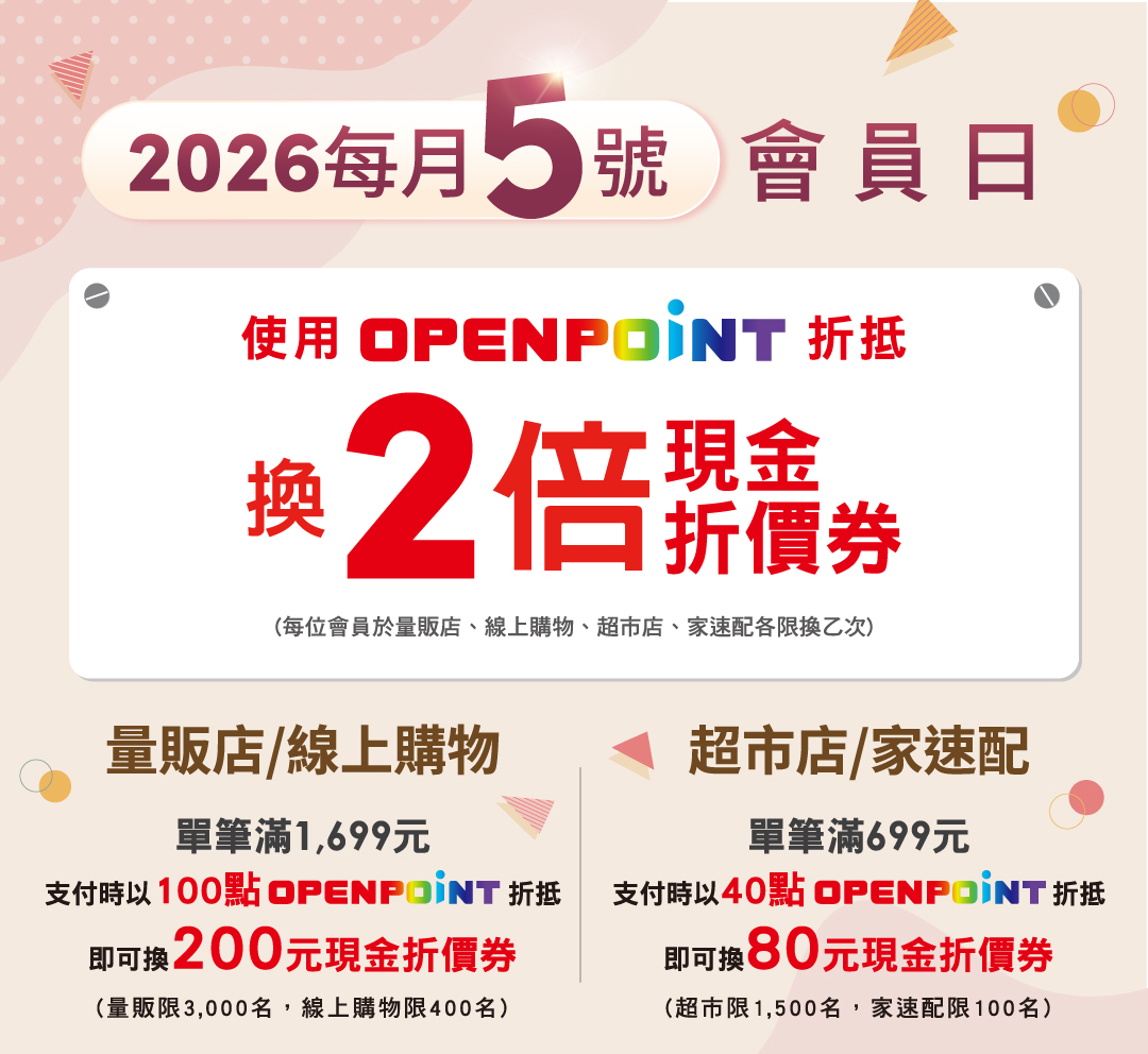 - 活動自2026/3/5~2026/6/5,每月5日,量販店/線上購物:每人當日最低可使用 100 點 OPENPOINT,最高兌換 200 元現金折價券(量販限3,000名,線上購物限400名)。超市店/家速配:每人當日最低可使用 40點 OPENPOINT,最高兌換 80 元現金折價券(超市限1,500名,家速配限100名)每會員各通路限各兌換乙次。