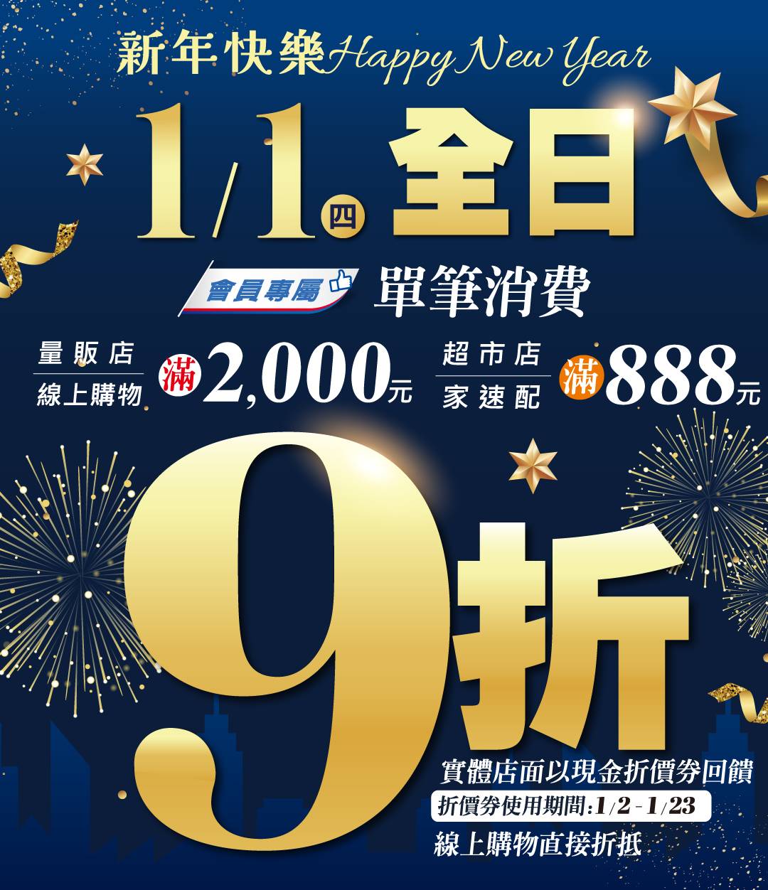 - 量販店單筆最高回饋5,000元現金折價券,超市店單筆最高回饋3,000元現金折價券。線上購物單筆滿2,000元享現折9折優惠,單筆上限折1,000元,部分商品不適用,不得與其他優惠活動合併使用;家速配單筆滿888元輸入折扣碼「快樂迎新年」享9折優惠,單筆上限折150元,部分商品不適用,每人限用一次, 詳情請見家速配APP。