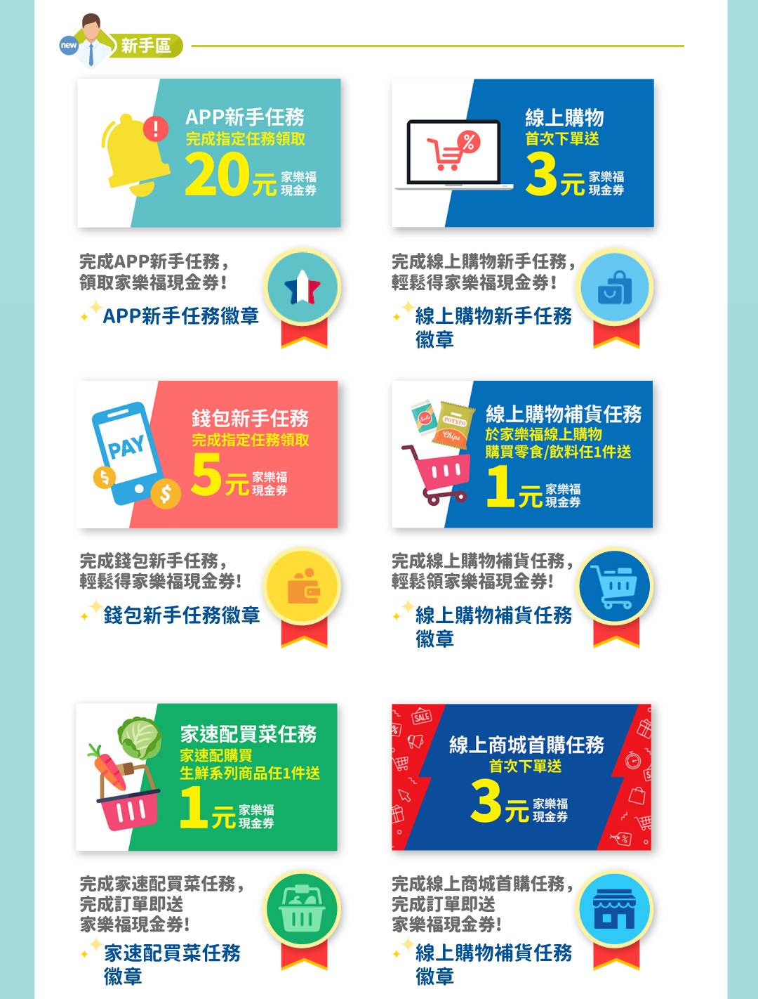 - App新手任務/錢包新手任務/聯名卡友獨享任務/線上購物新手任務的家樂福點數獎勵,將於24小時內自動匯入帳戶。