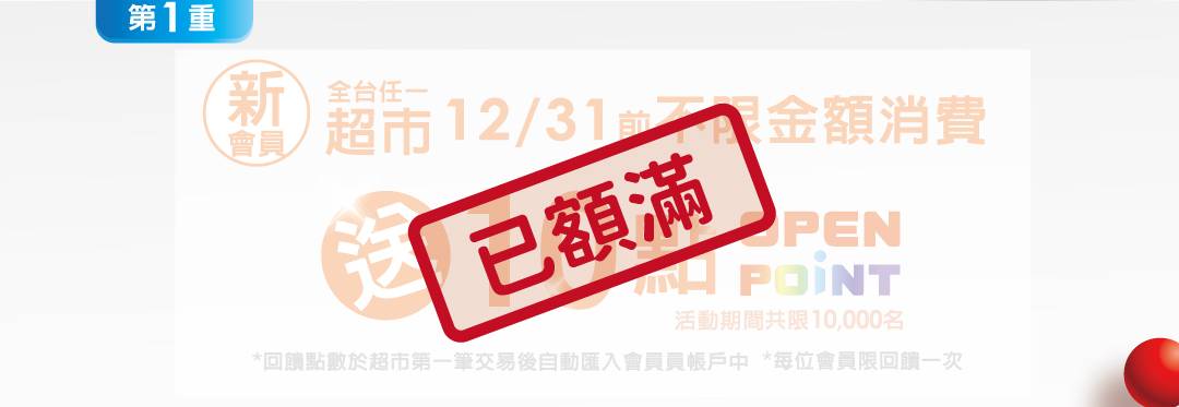 - 第一重【新會員不限金額消費送10點OPENPOINT】:限2025/2/5-2025/12/31期間加入新會員且於全台任一超市不限金額消費,即可回饋10點OPENPOINT,回饋日期於超市第一筆交易後自動匯入會員帳戶中(活動期間共限10,000名)