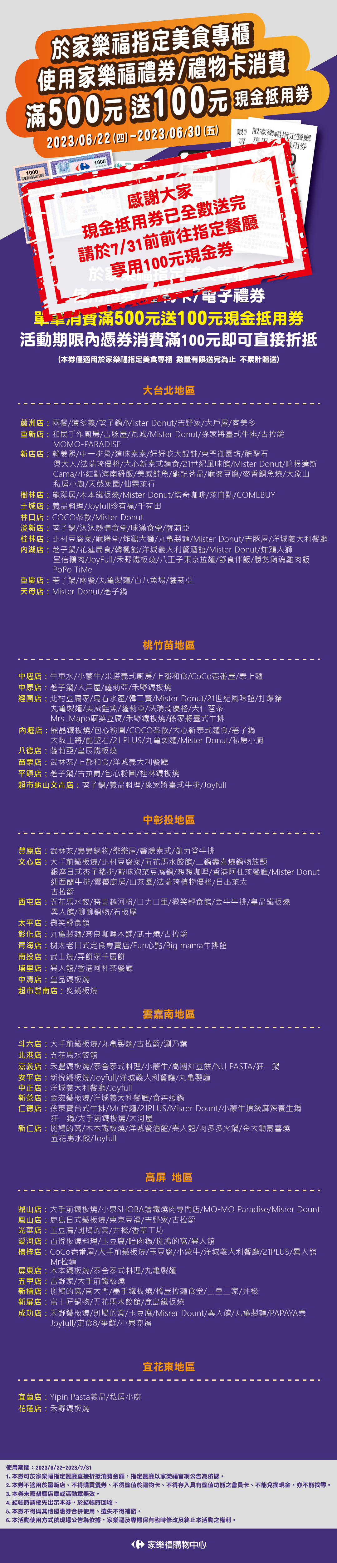 家樂福指定美食專櫃使用禮券禮物卡消費滿500元送現金抵用券( 送完為止)