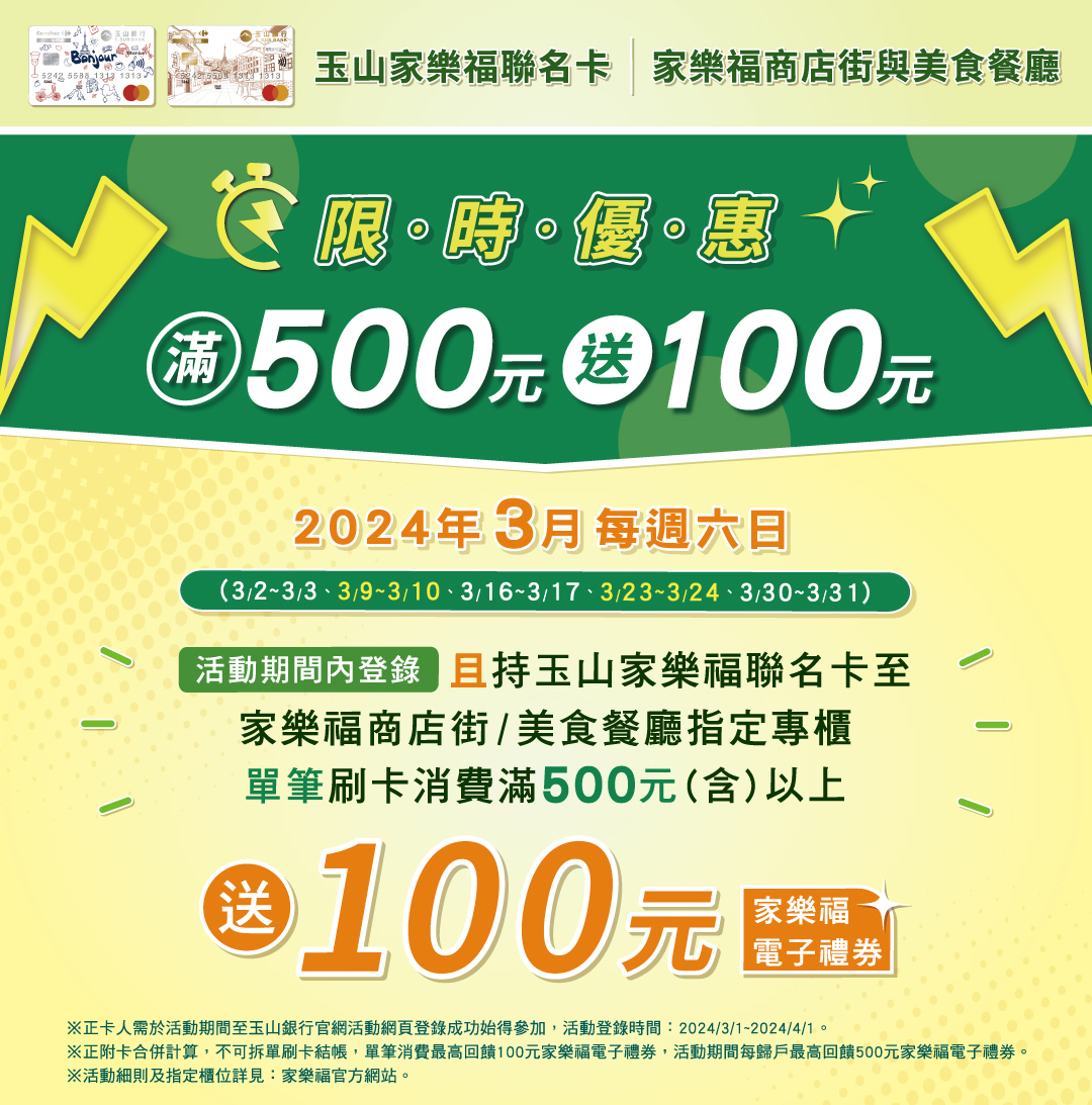 3月每週六日限定!!買500元送100元電子禮券 聯名卡友獨享!